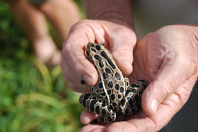 Members jumped on the hay rack for a tour of the vegetable plots, windbreaks, native perennial prairie and wetlands all of which increase habitat quality for native pollinators. Whereas corn is wind pollinated these insects are crucial for fruit and vegetable production. Jan Libbey showcased the talent of her farm hands by inviting intern Andrea to share an article she wrote for the CSA newsletter about industrial agriculture and industrial food. Folks got to try their hand at insect netting, and someone even discovered a large leopard frog.
