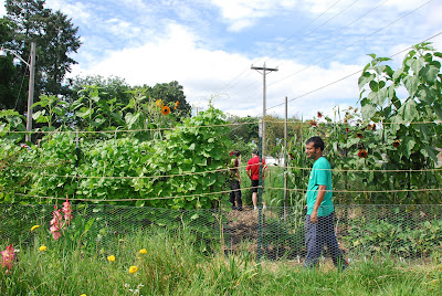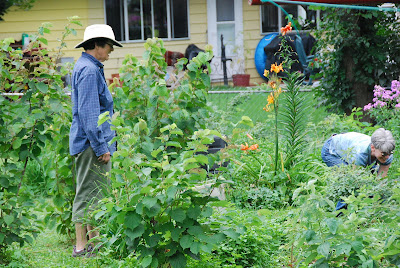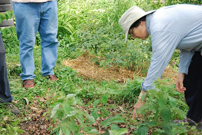 Finally, the third stop was at the home of Helen Gunderson featuring creative construction of garden scale facilities for processing (an outdoor sink), Chicken housing (a Chicken Hilton), and lasagna bed gardening. Her creative use of fencing as a trellis for grapes as well as impressive beds of ripe raspberries.
