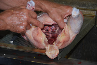 The legs are then cut off. The chicken is placed on it’s back in a small tub. Then the leg joint gets bent back slightly and you make a few cuts at the top of the joint and further down until the leg is free. It is important to have a sharp knife at this stage.