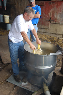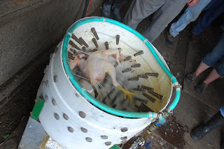 To start the process, the chicken is put head first in a cone that is attached to the wall. The feet are clamped together (to prevent the bird kicking out of the cone) and the head is pulled out the open bottom of the cone. Pull the head down, find the general wind pipe area, then insert a sharp knife into the windpipe and cut quickly to the right. Barney and Suzanne generally kill 2 at a time and let them bleed out to make the rest of the processing more efficient. There are four cones attached to the wall of the barn, allowing for four birds to be in cones at one time.After the birds are allowed to fully bleed out, they are moved in pairs of two on to the scalder. The scalder is water kept at exactly 150 degrees, and the birds are dunked and moved around (being held by their legs) for one minute. Barney and Suzanne have a water pot that has a flame and temperature regulator on it, run by a propane tank. The propane can be either turned up or down depending on temperature needs.