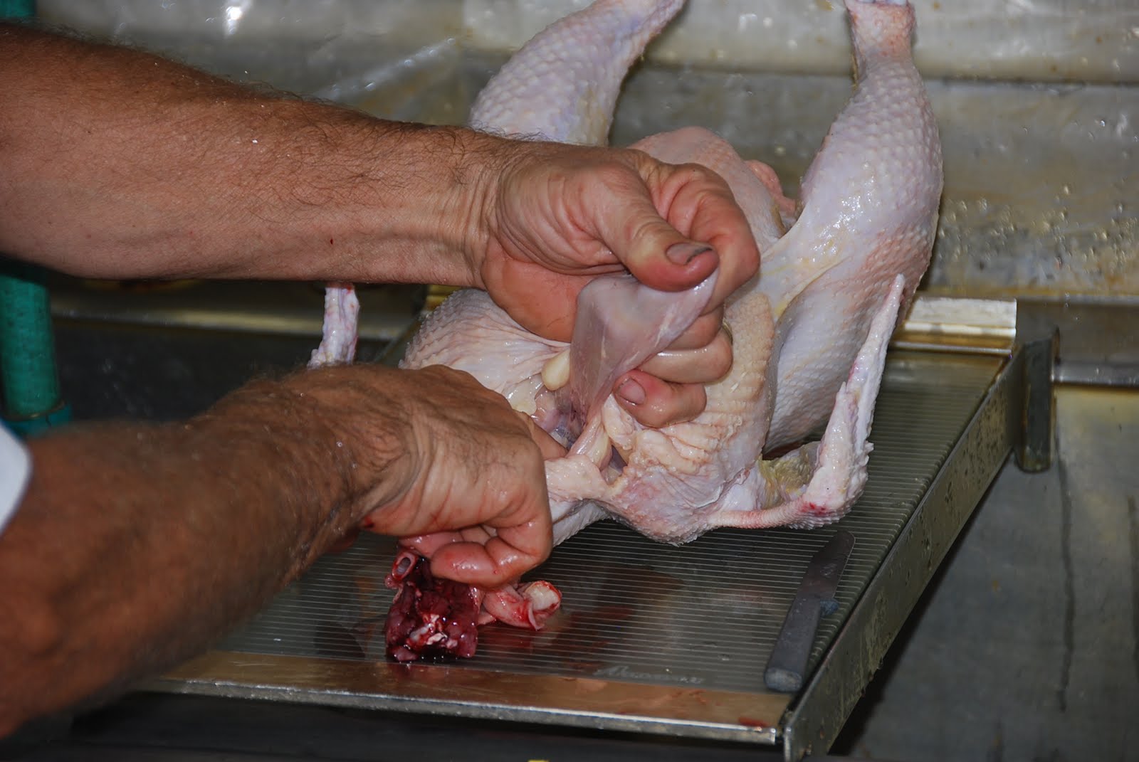 The first step in evisceration is to remove a small gland above the tail. Cut horizontally at approximately the second row of tail feathers (when the bird is sitting on their stomach) then cut upwards until the small piece is cut out.Next, the bird is flipped onto it’s back and a small cut is made by the neck. Work your fingers into the bird and loosed up the windpipe. The pipe feels like it has little ribs on it. This part takes some practice, but isn’t that complicated.