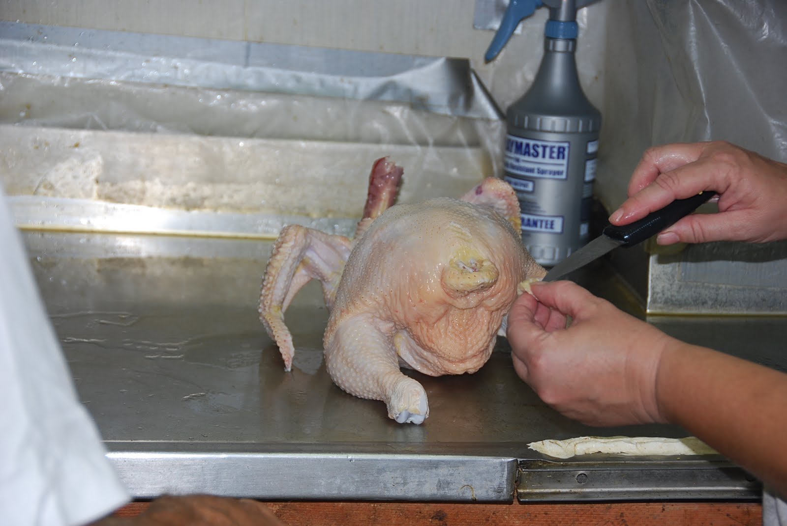 Next, the bird is flipped onto it’s back and a small cut is made by the neck. Work your fingers into the bird and loosed up the windpipe. The pipe feels like it has little ribs on it. This part takes some practice, but isn’t that complicated.