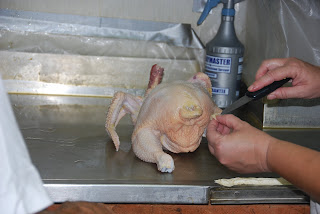 The chicken is then moved into the clean room for evisceration. This room is kept clean with bleach solution, and all surfaces are stainless steel. There are also hoses hooked up near the sinks in this room to have immediate access to water for cleanup and sanitation.