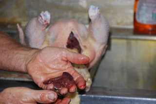 From there, cut right underneath the ribs near the anus, and make small cuts until a small ways above the anus. Reach your hand into the cavity made, and remove first off a small chunk of fat. Take out the gizzard, liver, and heart (Barney and Suzanne keep these to feed to dogs, etc.). At this stage also take out all other entrails and put them in the gut buckets.