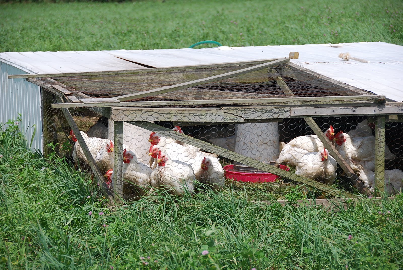 Their poultry operation is based on the pen style popularized by Joel Salatin. The pen is low to the ground and has sheet metal on 3 sides and wire on three sides. These “Chicken tractors” are moved daily or twice daily to fresh pasture and can hold approximately 50-75 birds in a 10×12 area.