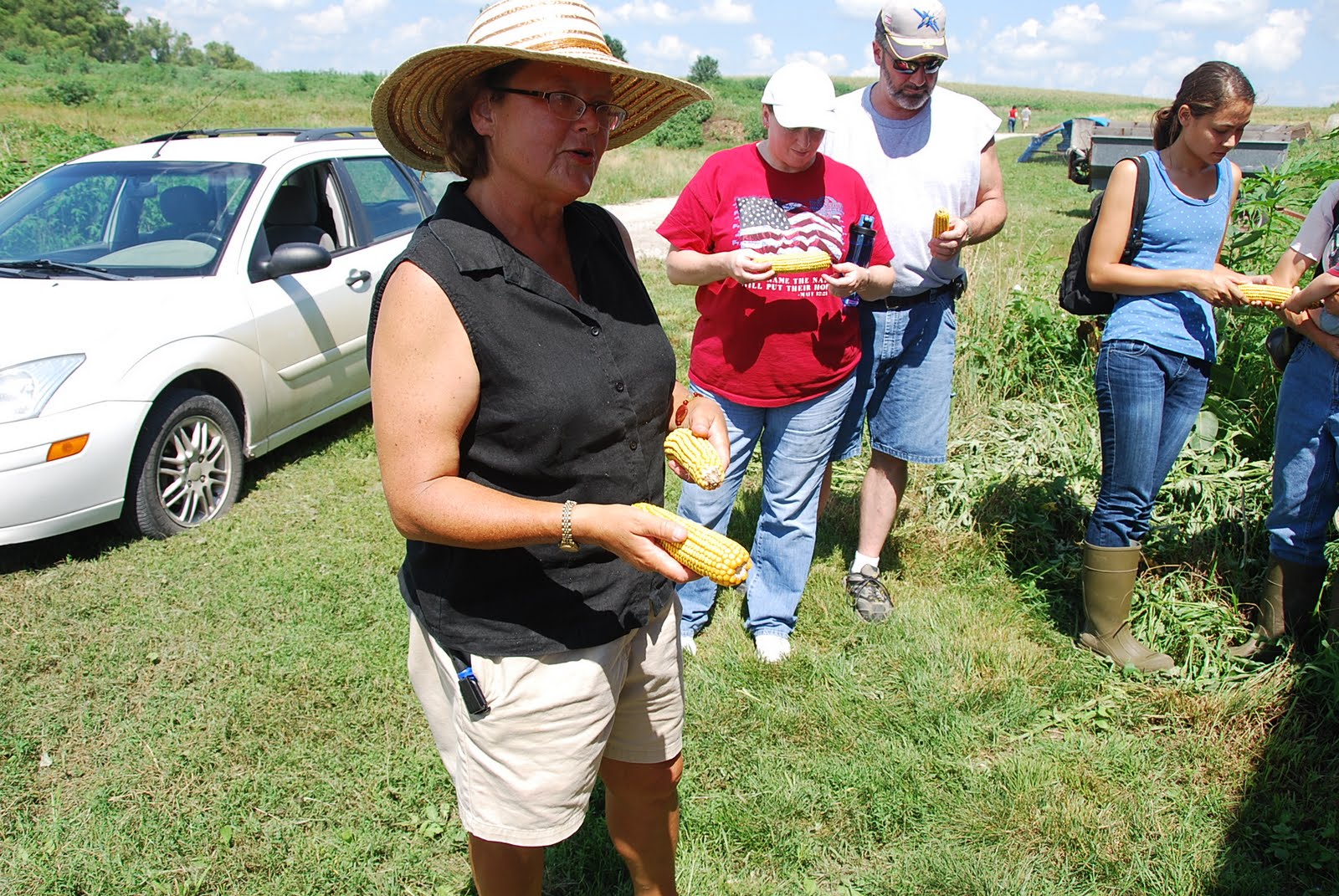 On Sunday, August 1 at the farm of Laura Krouse near Mt. Vernon in east central Iowa farmers and eaters learned the importance of pollination. Laura and USDA corn breeders Linda Pollak and John Golden taught attendees different methods of improving, selecting and storing corn seed.