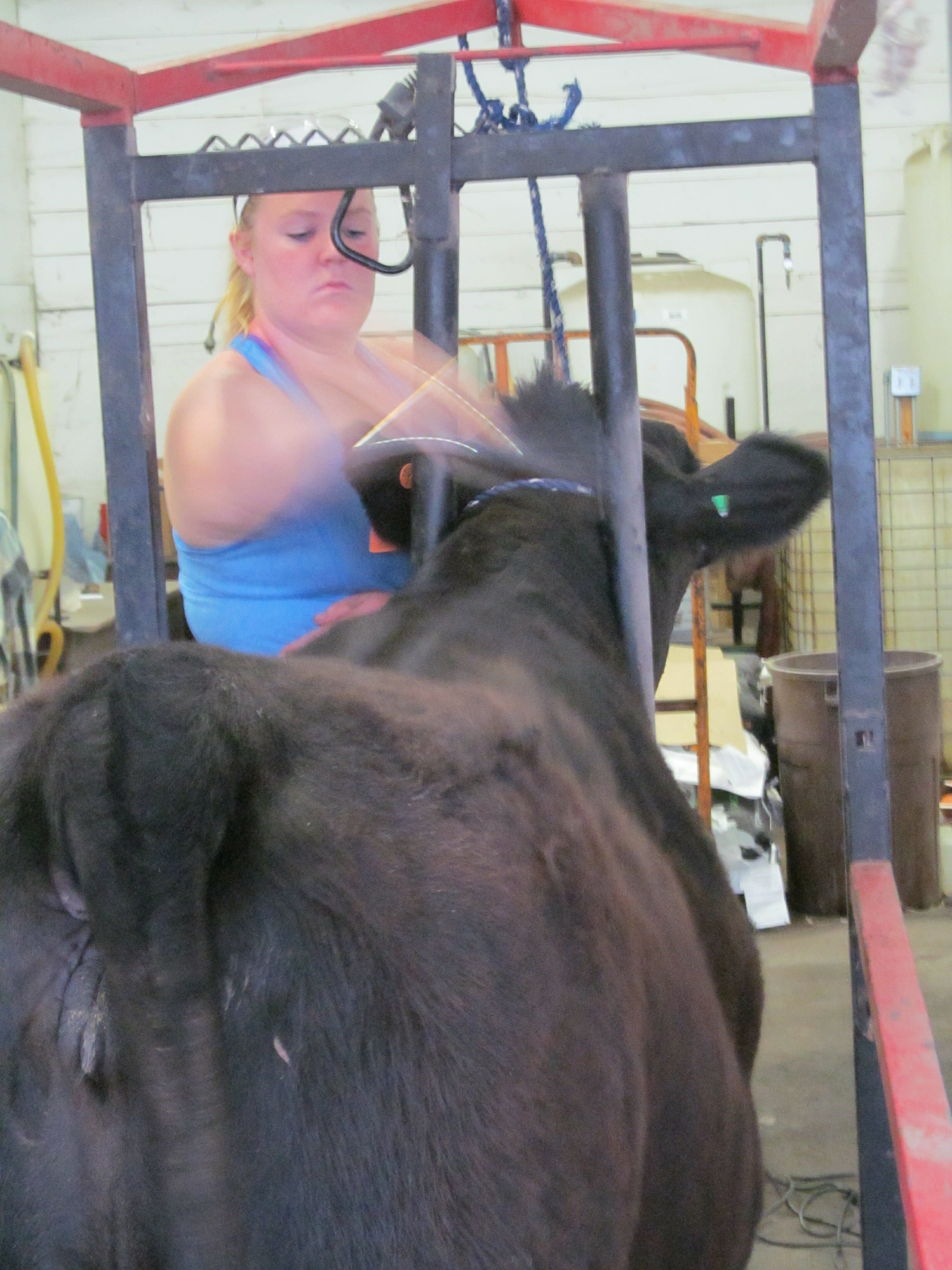 Julia and Craig also demonstrated some hair care for show cattle. To create and emphasize a deep, blocky appearance on one of Julia’s show heifers, they showed how to brush and clip the fur on her topline and forequarters. The tail is trimmed on the sides to create some clean lines when looking from the rear, and carefully trimmed on the top of the tail and rump to create a square silhouette. The topline is similarly made “flat,” and hair on either side of the topline brushed up then clipped to stick out a bit but look square, making her look wider when viewed from behind. The heifer’s head, neck, and brisket were clipped fairly close to sharpen her front end, though her belly was left long to make her look nice and deep. Later on, closer to the show, she’d get a proper bath and loose long hairs would be trimmed.