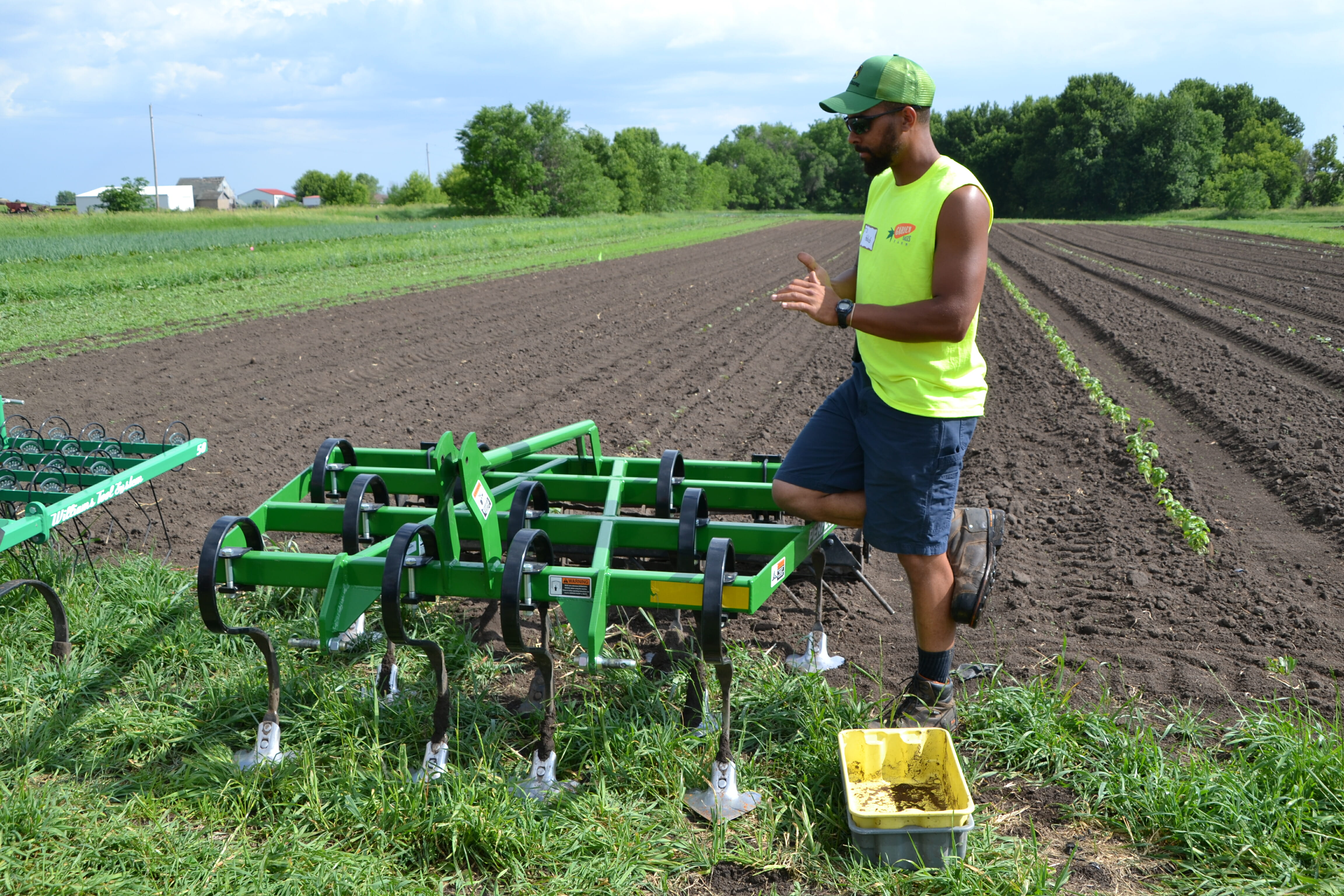 T.D. seeded beets and carrots, below with a Jang seeder, using the X24 plate (the radish plate). He is pleased with the carrots, but for the second year in a row, unhappy with beet establishment. If T.D. is direct seeding, after he uses the Perfecta (below) he comes back through and marks rows by just touching the top inch of soil with the cultivator, using welded-on row markers (made from cut down plow points). “If you can drive a straight line, you’ll never have to run a string-line ever again.”