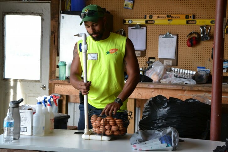 T.D.’s batch egg washer is made of PVC, “I made this for ~$5. Set the basket on top of the PVC square on the bottom, which has holes drilled in it. Connect the air compressor with warm water and it starts bubbling… Do not turn the air compressor up higher than 30 PSI, or you’ll start breaking eggs. I get 3-4 baskets of eggs a day, and we have them all washed in 6 minutes.”