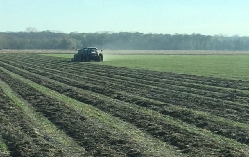 Kevin applies fertilizer ahead of corn, with 95% of fertilizer on the farm coming from hog manure. He does not broadcast his manure on top of his fields, instead preferring to knife in 3,000 gallons with a vertical till manure applicator in rows with 30-inch spacing. He then plants the corn directly on top of the manure in the 30-inch strip.