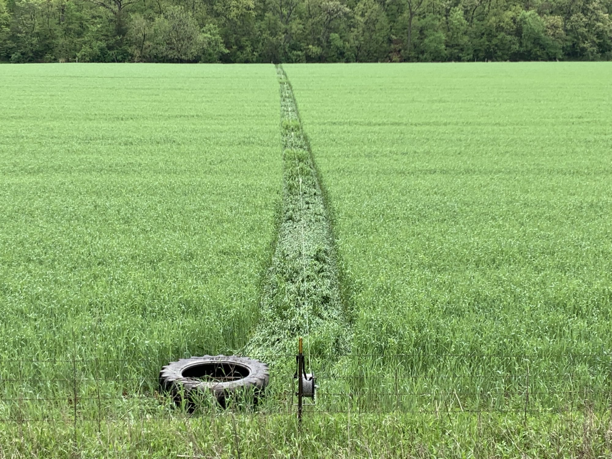In preparation for grazing his cover crop rye, Rick drags a tire through the field to lay down the plants in a line to be able to run electric fencing and create a paddock. Photo courtesy of Rick Matt.