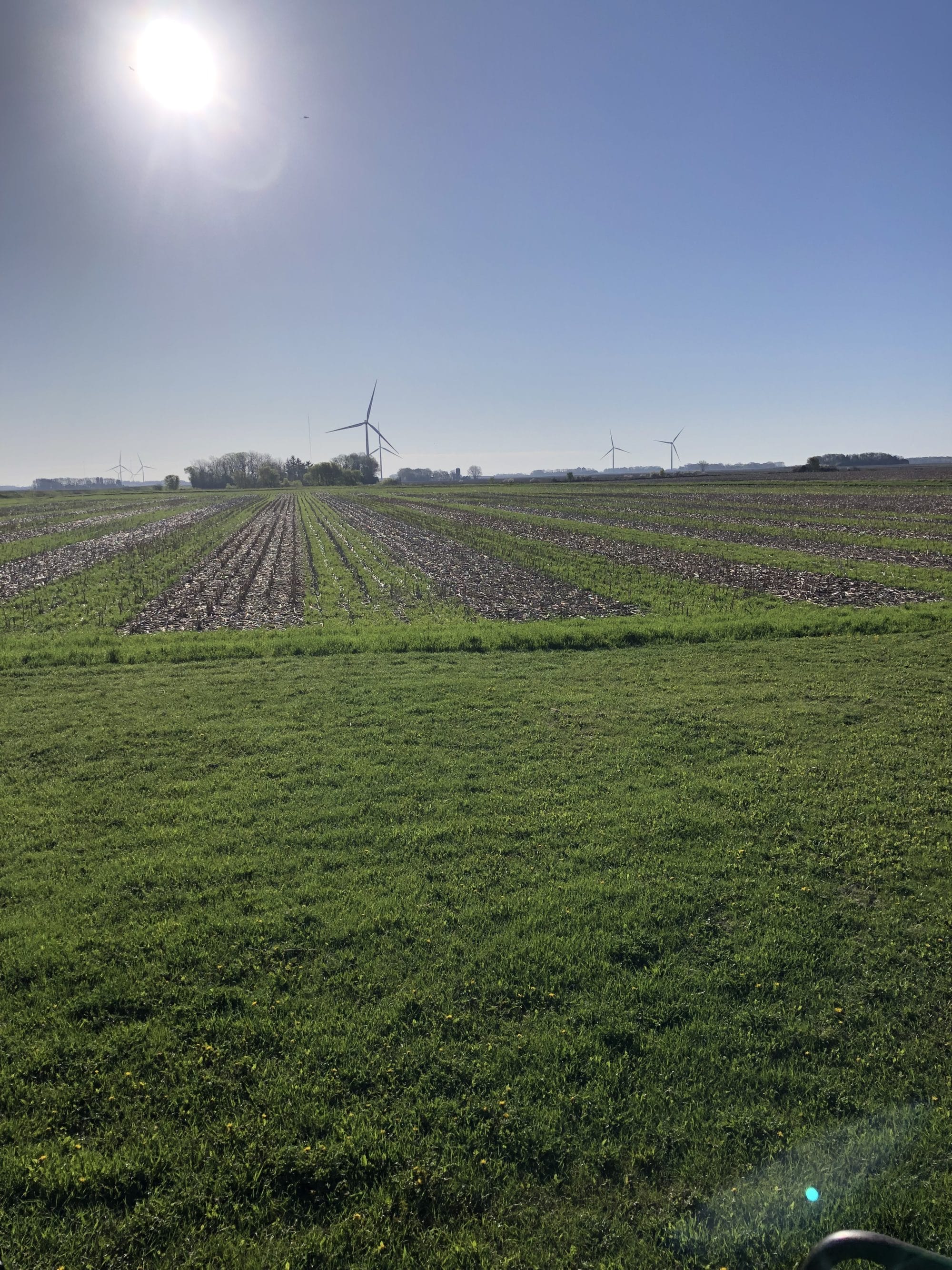 Tracy Skaar’s winter barley did not survive the winter. Green strips are winter rye treatments; brown strips are winter barley. Photo taken April 2025.