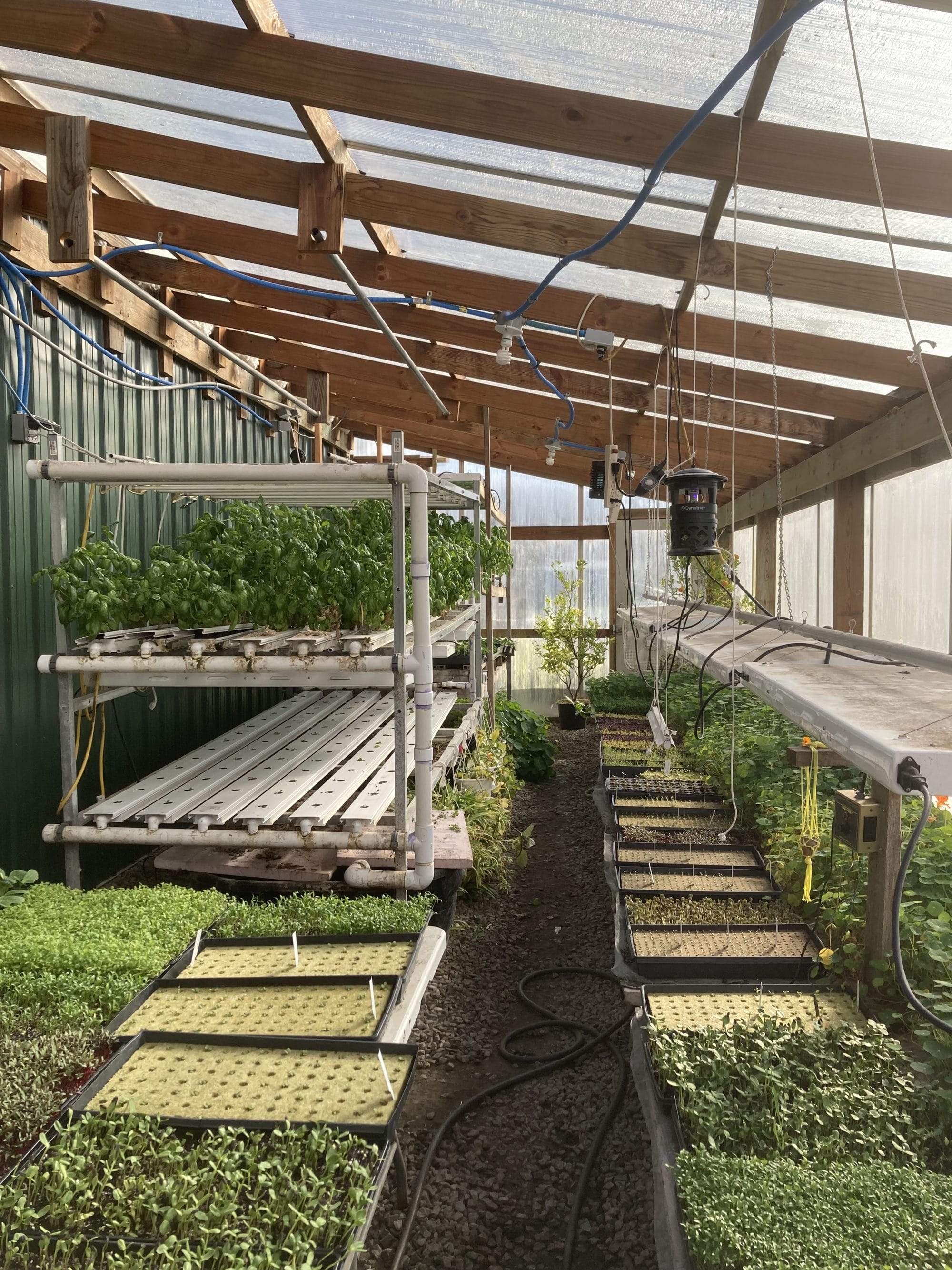 Lee Matteson’s nursey greenhouse. In addition to herb and microgreen production, this heated greenhouse is where the seeds are germinated before being transplanted into the hydroponic system. Seeds in media cubes are visible in various stages of germination in different trays. Photo taken March 11, 2025.