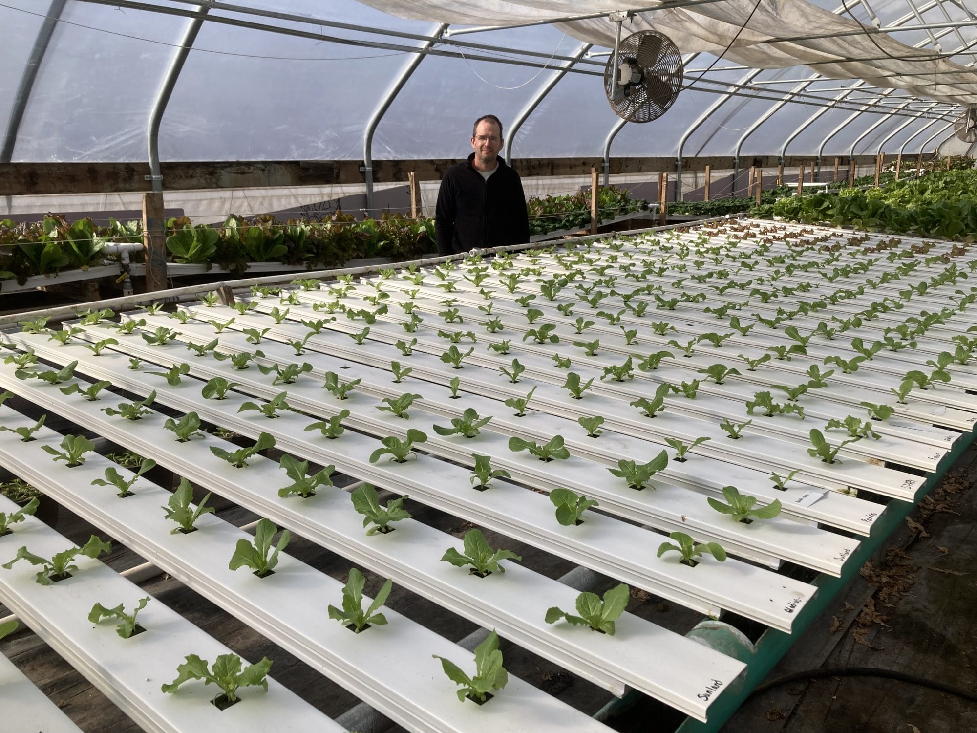 Growth in hydroponic systems is easier for plants, but it also confers some advantages to their human caretakers. Without soil, growers have more flexibility to control the environment around the plants: water and nutrients are abundantly available to plants without competition from weeds, indoor growth means that temperature, lighting, and insects can be controlled. Matteson has high tunnels and greenhouses where he grew greens in the shoulder seasons in the ground and started transplants for summer and grew tomatoes and cucumbers in high tunnel soil. Disease outbreaks, especially powdery mildew, motivated him to try something new. He began experimenting with hydroponic green production and growing his tomatoes in bags of fertigated media. Matteson has found that the modular layout of his hydroponic setups enables multiple generations of plants to be grown in quick succession: he moves germinated seedlings in their media cube into the setup, lets them grow, harvests, scrubs out the setup, rinses, and repeats.