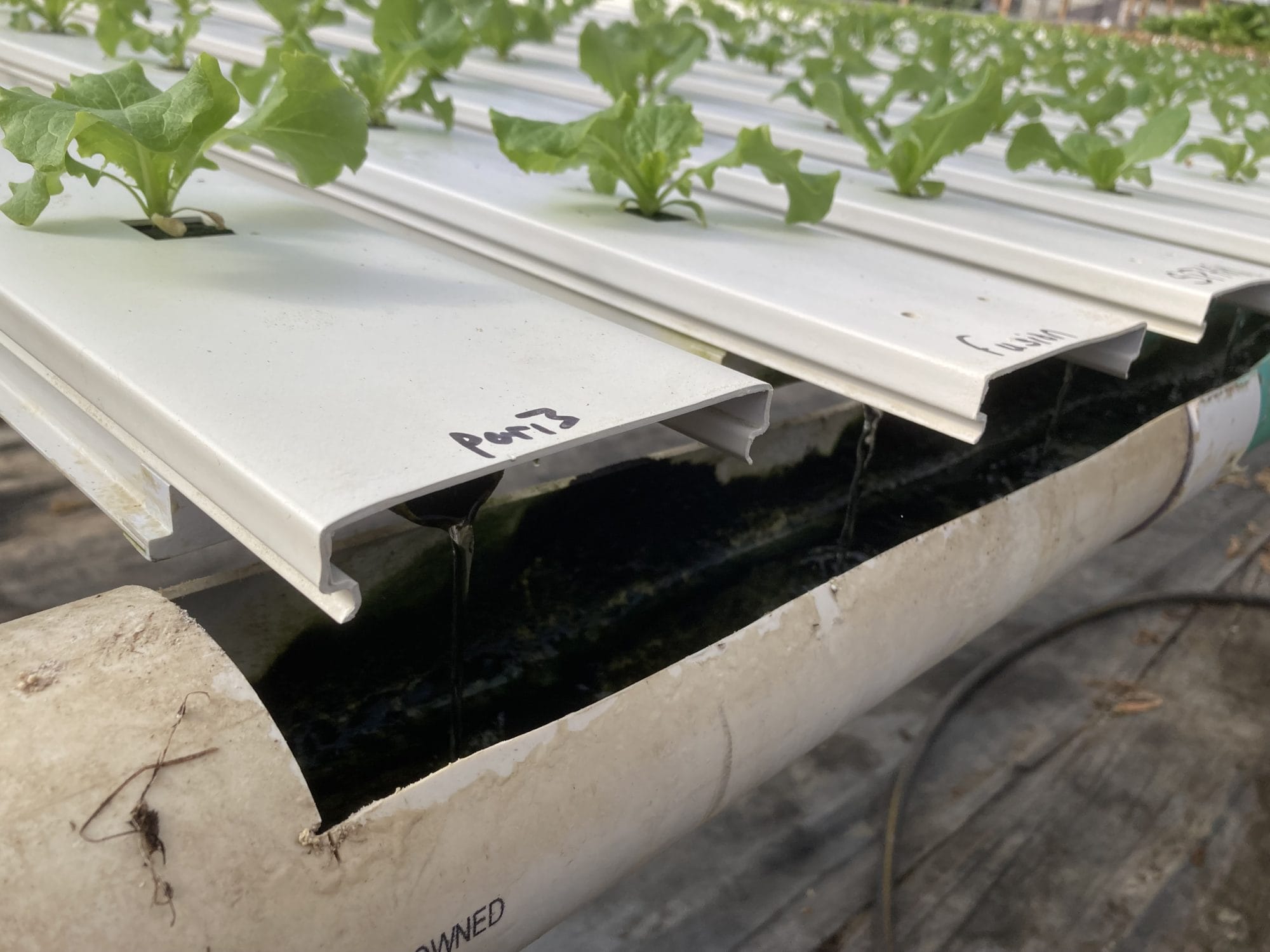 Closeup of part of Lee Matteson’s nutrient-film-technique (NFT) hydroponic setup. The black on the inside of the PVC collection tube is algae. Algae grows wherever there are water, nutrients, and light, and can affect nutrient use efficiency but generally does not hurt plant quality. Photo taken March 11, 2025.