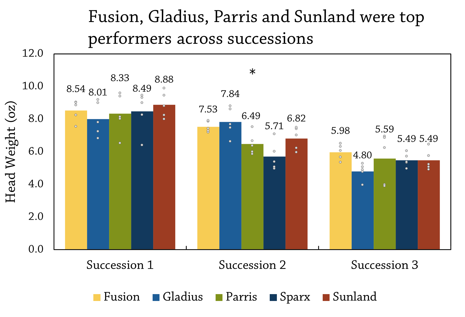 - Fusion, Gladius, Parris, and Sunland were top performers across successions; all these varieties were statistically equal to one another in head weight.