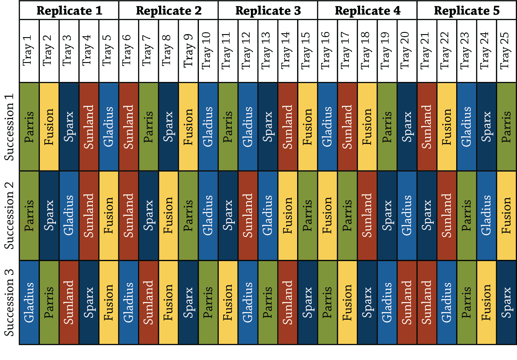 Matteson grew five replicates of the five varieties in each of the three successions. The random arrangement of varieties within each replication is shown in Figure A1.