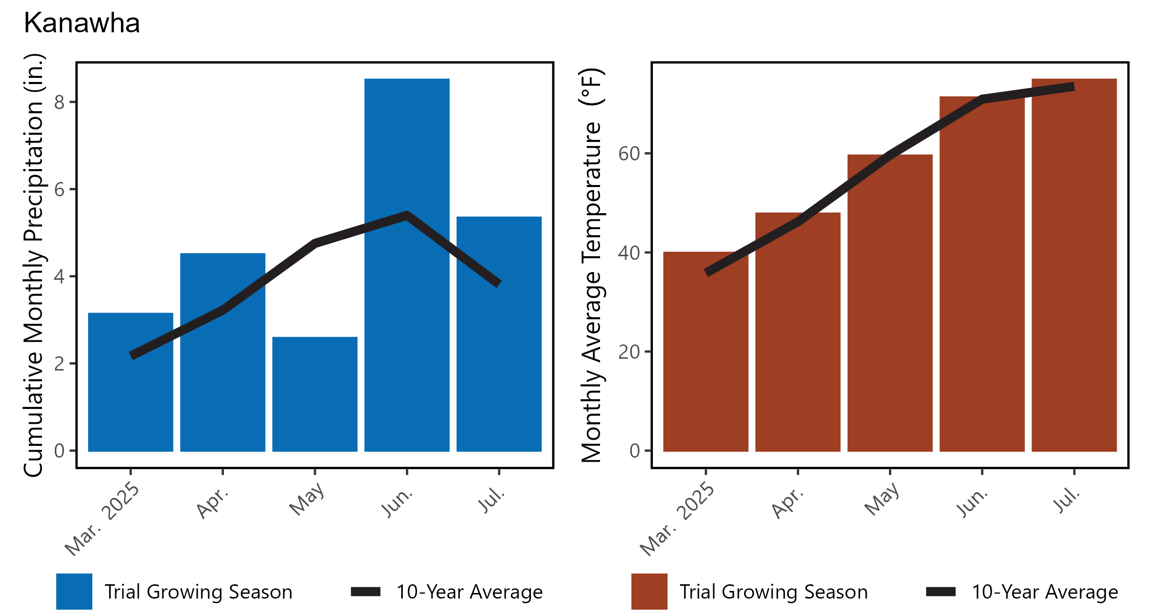 Test strips in the oat variety trials generally overperform national and state averages for bushels per acre. The 2025 average yield in the US nationally was 76 bu/ac and Iowa was 80 bu/ac [1]. Nashua yielded 154% of the state average, with 123 bu/ac as a site average across varieties (Table 3). Nashua’s yield was very similar to recent years; four bushels lower per acre than the average site average from the last three years (2022 through 2024). In 2025, Kanawha’s yields were less than half those of recent years, with a site average of 55 bushels per acre (Table 2). This was due to very heavy rains (see weather figure below), and an assessed 100% lodging rate. Even with the losses from lodging, Kanawha’s 55 bu/ac is 74% of the national average and 69% of the Iowa state average in 2025. Nashua was harvested 25 days earlier than Kanawha, leading to much lower rates of lodging and yield losses.