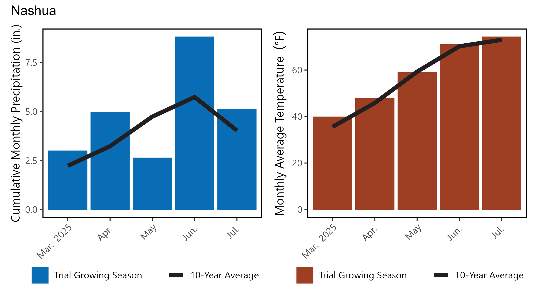 Variety trials were conducted at two locations in 2025: ISU Northern Research Farm in Kanawha and ISU Northeast Research Farm in Nashua. These variety trials build on previous trials conducted at Kanawha, Charles City, Boone, Nashua and Greenfield from 2015–2024 [2 – 11]. Information about each of the varieties grown in these trials in 2025 can be found in Table 1.