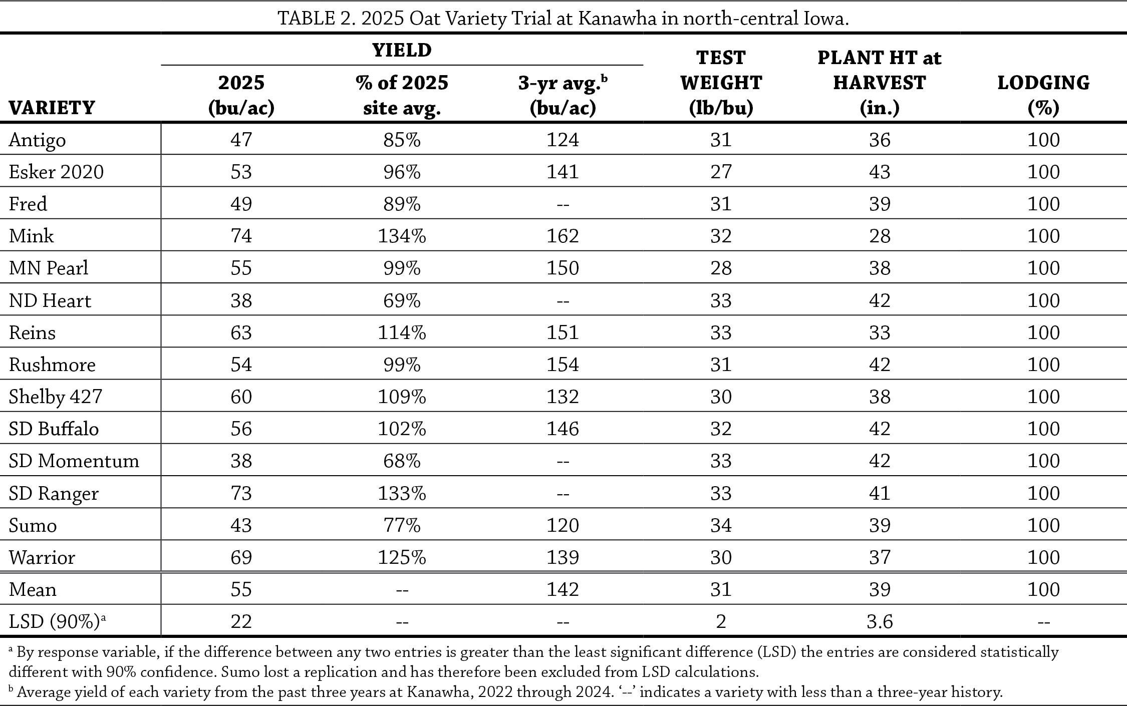 SD Ranger, a new variety released by South Dakota State University in 2025, performed well at both sites. It was in the top LSD groups for yield at both sites. It had test weights of 33 and 34 lb/bu at Kanawha and Nashua, respectively. It yielded 2.0 tons of straw per acre at Nashua. SDSU suggests that it could replace Rushmore. In our tests, SD Ranger yielded more bushels per acre at both sites, a higher test weight at Kanawha but lower at Nashua, and more straw at Nashua, compared to Rushmore.
