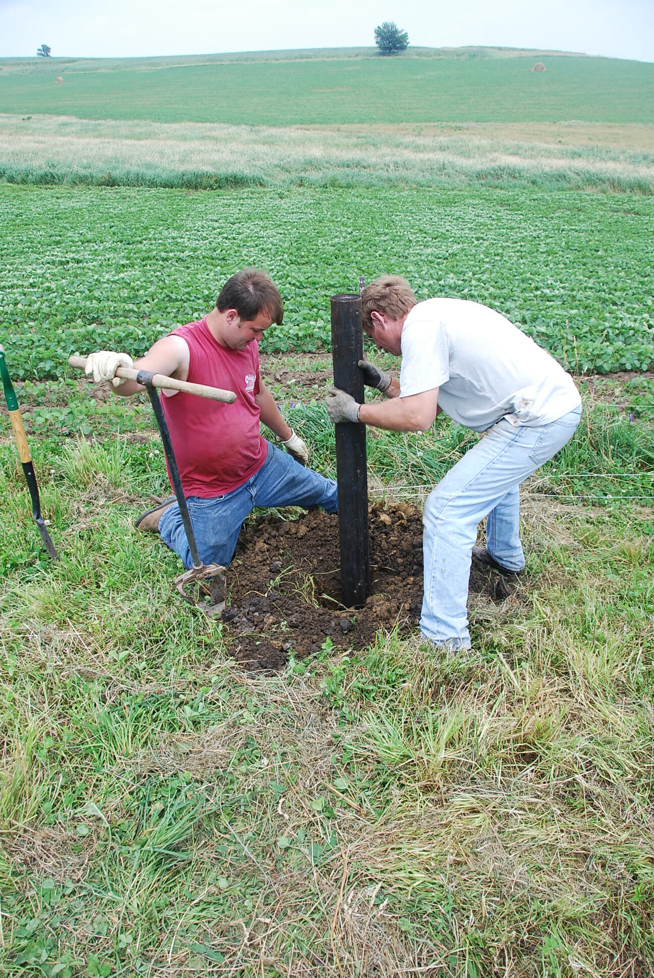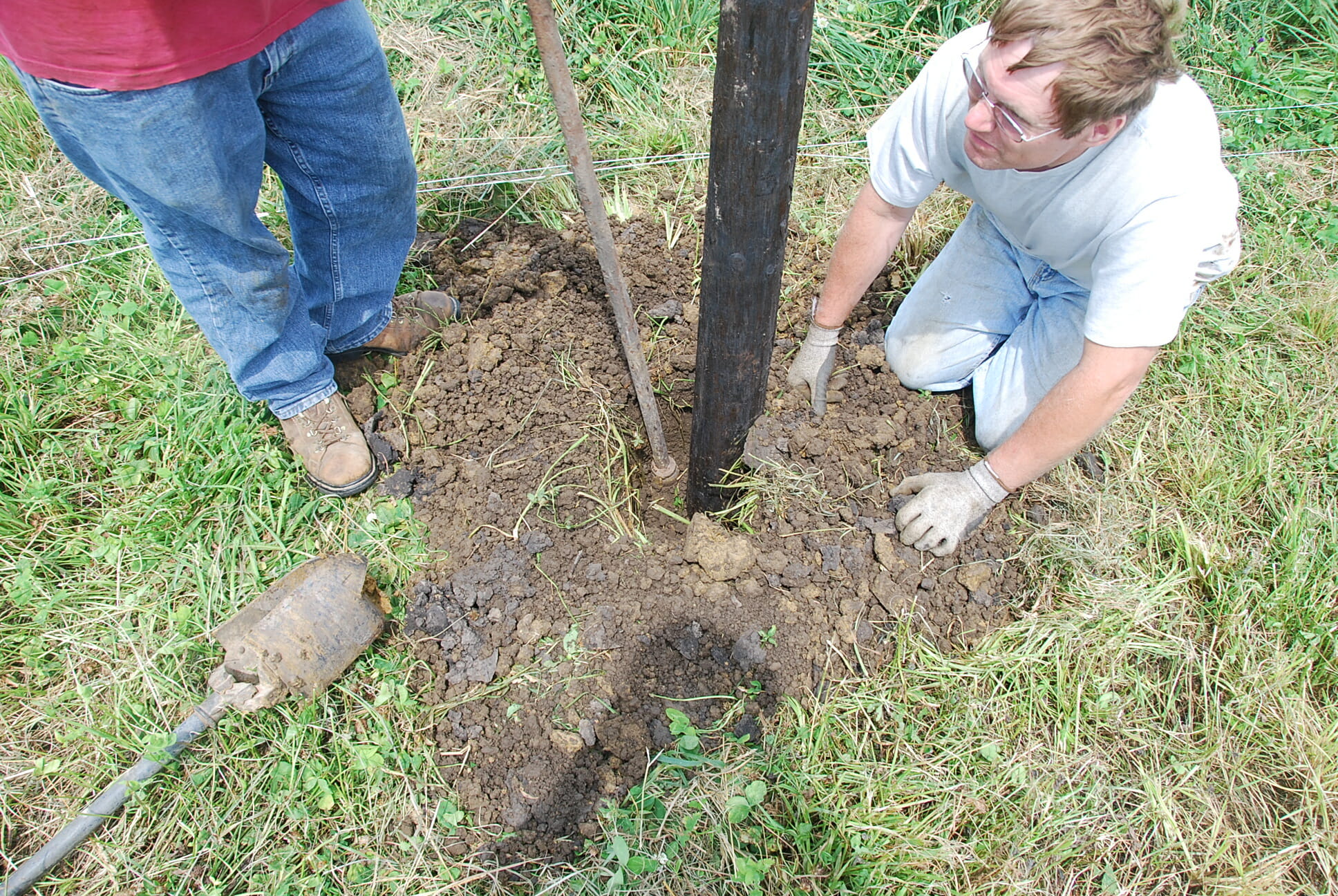 These fiberglass posts (7/8-inch Sunguard II from Geotek) can be pounded in using a post pounder. Jason had custom-made narrow post pounders, but that is probably not necessary. If you stand straddling the wire while you start, it is easier to get the post in the ground straight.