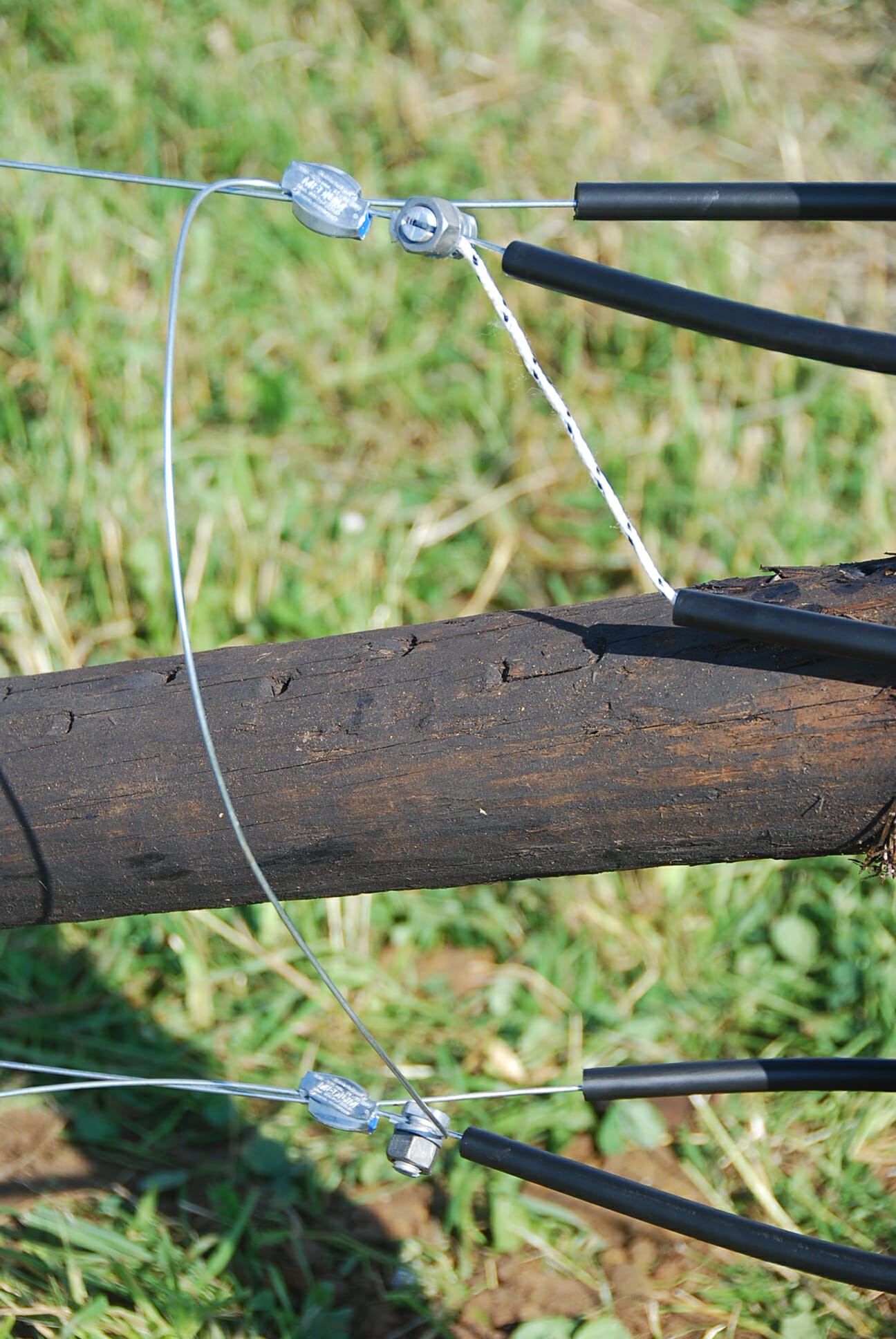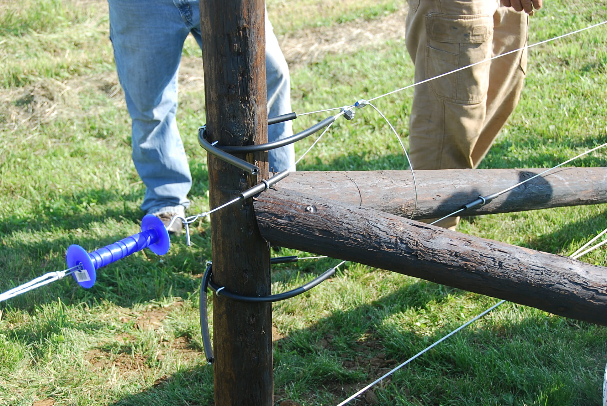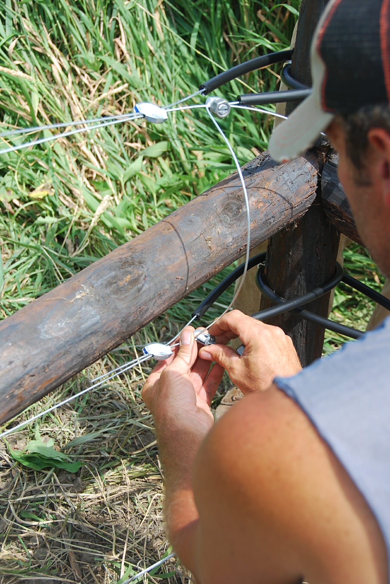 We used pre-made U-clips (stiffer than wire) to attach the wire, but high-tensile wire could also be used. These posts come with holes pre-drilled. The clips are simply inserted through two holes around the wire and the two ends are bent in opposite directions.